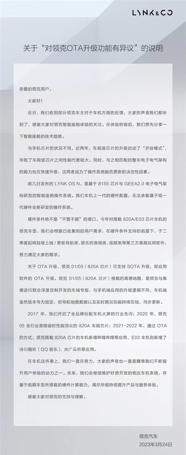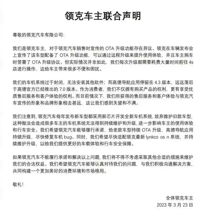 领克老车主们联合声明要求维护老车型OTA,领克官方回应