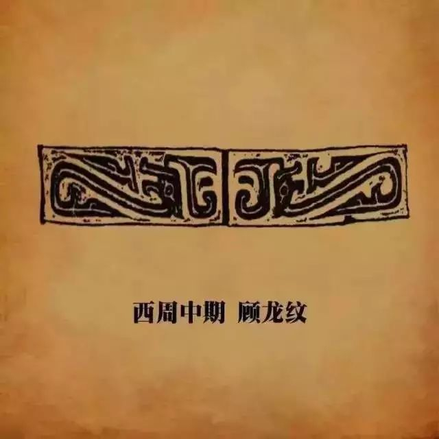 顾龙是指作回首状的龙,除了头的方向不一样,基本形状与夔龙纹大体相似。它盛行于西周中期,通常几条龙两两相背,中轴对称以纹饰带形式饰于器物的口沿和颈部。
