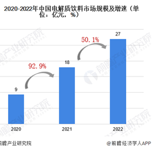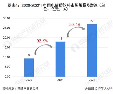 报告显示,2022年电解质饮料市场规模同比增长50.1%,达27亿元。这让电解质饮料一跃成为2022年国内饮料行业市场规模同比增速最高的饮品类别。