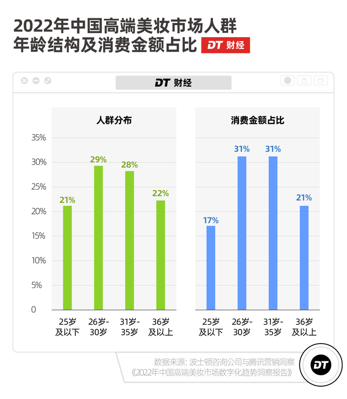 根据《2022年中国高端美妆市场数字化趋势洞察报告》,在各个年龄段中,26岁-30岁和31岁-35岁消费者所贡献的消费金额占比是*的。而在所谓“贵妇”惯常指代的36岁及以上的人群中,消费金额占比仅比25岁及以下的年轻人多一点,后者通常是大学毕业后、工作三年以内的年轻人。