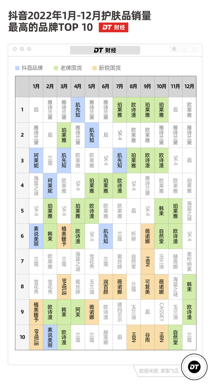 2022年1月-12月抖音护肤品销量榜中,最多的时候,榜单前10名里有6个是国货。