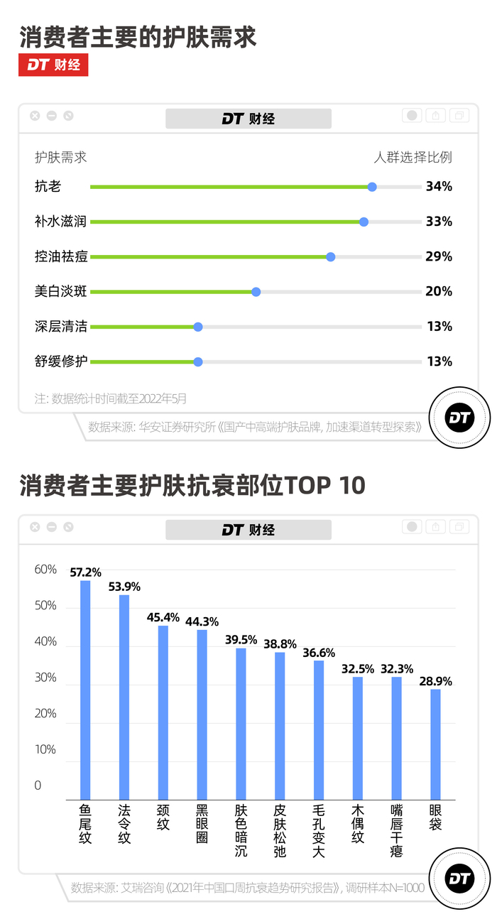 据华安证券《国产中高端护肤品牌,加速渠道转型探索》报告中的调研数据,抗老(34%)是消费者护肤最关心的问题。其次是补水滋润(33%)、控油祛痘(29%)。