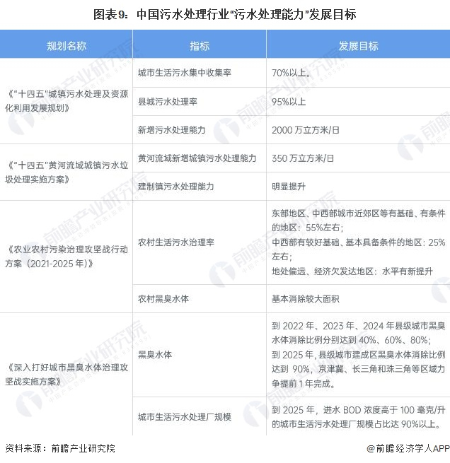 2021年6月,国家发改委、住建部联合印发《“十四五”城镇污水处理及资源化利用发展规划》,提出了“十四五”时期城镇污水处理及资源化利用的主要目标、重点建设任务,以指导各地有序开展城镇污水处理及资源化利用工作。2022年1月,生态环境部联合五部门印发《农业农村污染治理攻坚战行动方案(2021-2025年)》,聚焦农村污水治理、黑臭水体整治等重点工程,为实现乡村生态振兴提供有力支撑。“十四五”期间污水处理行业发展目标分析如下: