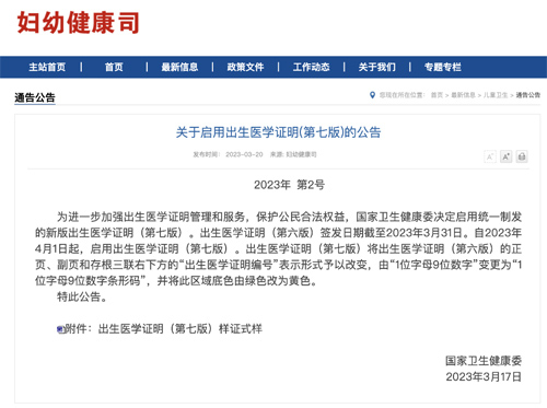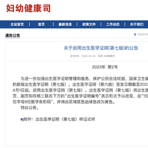 为进一步加强出生医学证明管理和服务,保护公民合法权益,国家卫生健康委近日发布公告,决定启用统一制发的新版出生医学证明(第七版)。出生医学证明(第六版)签发日期截至2023年3月31日。自2023年4月1日起,启用出生医学证明(第七版)。出生医学证明(第七版)将出生医学证明(第六版)的正页、副页和存根三联右下方的“出生医学证明编号”表示形式予以改变,由“1位字母9位数字”变更为“1位字母9位数字条形码”,并将此区域底色由绿色改为黄色。