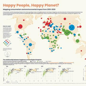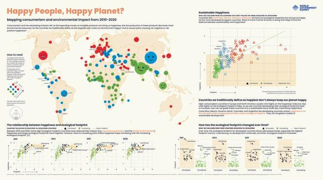 李清月团队的获奖作品“我们快乐吗?我们的地球快乐吗?”(Happy people,Happy Planet?)探讨的是“可持续快乐”的主题。海报上,她用精致的图表和地图探索地球人类的幸福感与消耗环境资源的关系,而在与李清月对话的过程中,也能频频发现“快乐”在这个北京姑娘心中的重要性。