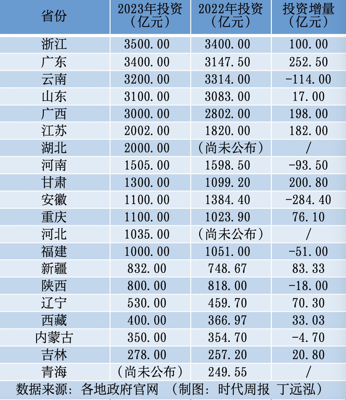 其中,在已公布的数据中,有5个省份的2023年预期投资超3000亿元,4个省份的2022年实际投资超3000亿元。