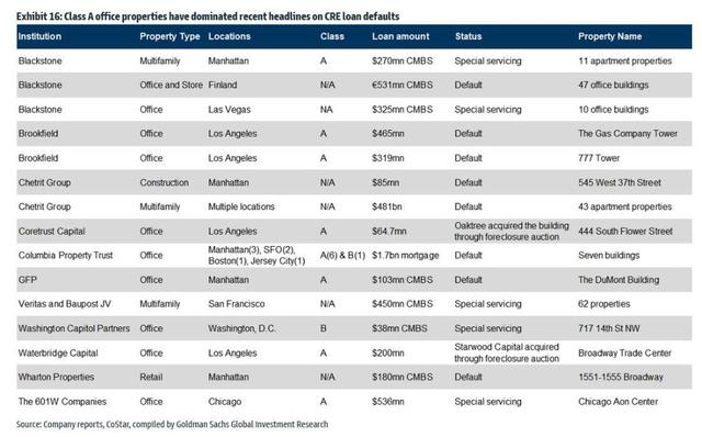 高盛还汇总了近期有关房地产违约的报道。结果显示,即便是像黑石这样的巨头在再融资方面也遇到了困难,CRE市场面临的困境可见一斑。