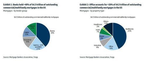 而在这2.8万亿美元中,有6270亿美元为业主商业地产抵押贷款,4680亿美元为收购、开发和建设项目(包括单户住宅开发)支持的贷款。减去以上两类贷款,美国有4.5万亿美元的未偿商业/多户抵押贷款,其中40%来自银行,约为1.7万亿美元。