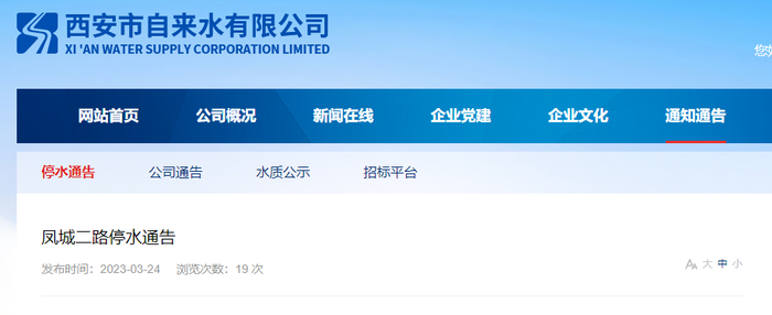 据西安市自来水有限公司消息,因配合西安市地铁八号线图书馆站管道回迁施工,西安市自来水有限公司需对凤城二路管道实施停水,具体停水情况如下: