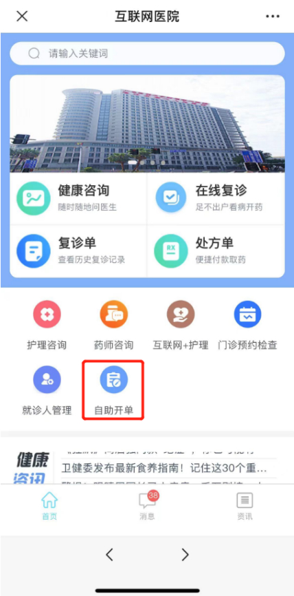 点击底部菜单【网络医院】选择就诊人进入互联网医院首页,点击【自助开单】,阅读体检预约须知;