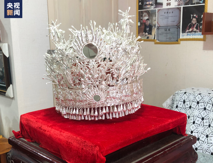 相关负责人介绍,苗族银帽是当地特色,为民间非遗技艺传承人手工制作,采取镂、刻、锤、缠等基本制银技艺,上面有蝶、牛、鸟、鱼等图案和花纹,重达1000克左右。