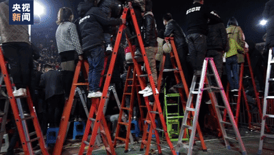 “‘村BA’开始咯!人太多,不踩梯子看不到噻!”当地的人字梯已经供不应求↓