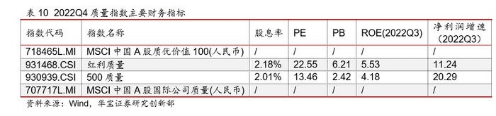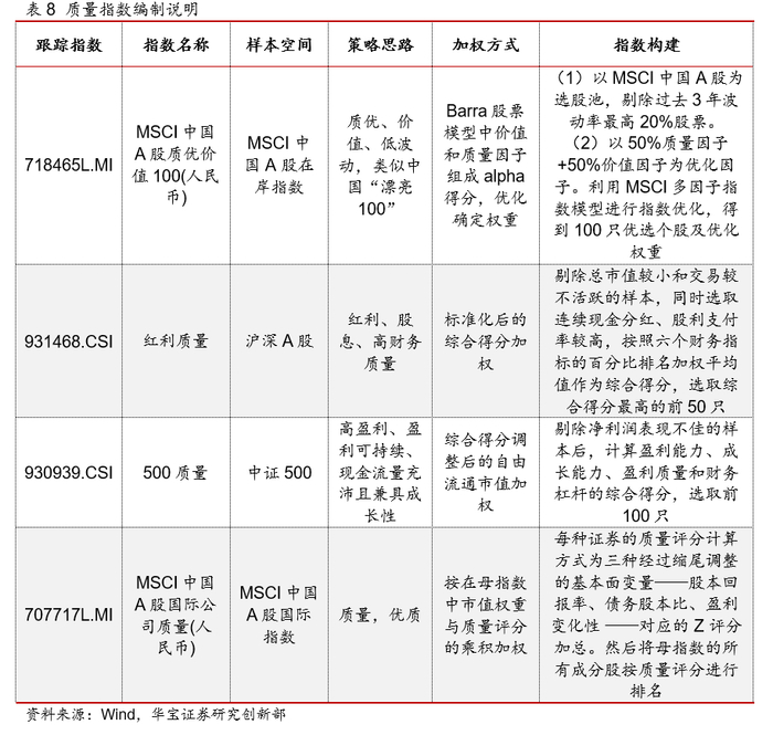 从指数的编制方法来看,四只指数中有3只指数先做一定的负向剔除,MSCI中国A股质优价值100在波动率上进行一定的剔除,红利质量剔除市值较小和交易不活跃的股票,500质量剔除净利润方面表现不佳的股票。在指数构建上,MSCI中国A股质优价值100基于质量和价值因子采用MSCI多因子指数模型进行指数优化,其余3个指数采用结合分红或盈利、成长、财务指标的基本面变量的综合打分的方式选取成分股。