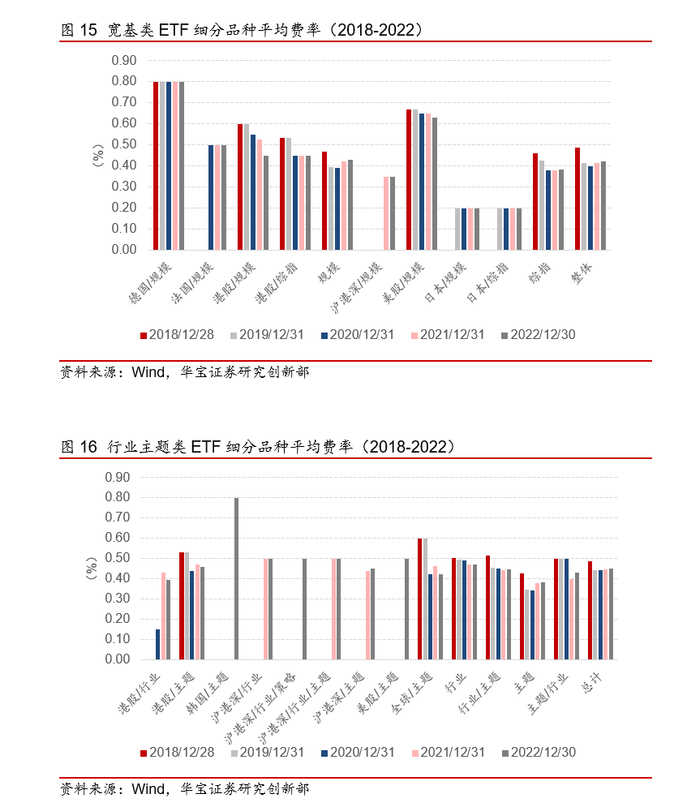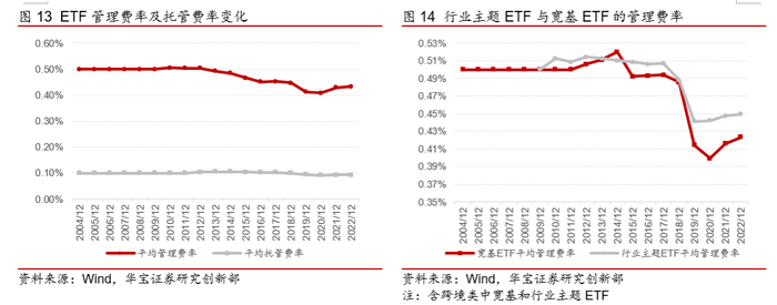 另一方面,与基金公司所处的竞争阶段有关。2019 年为 ETF 竞争白热化的年份,2019 年 3 月新入局ETF 战场的平安创业板 ETF 在发行时以 0.15%/年的管理费和 0.05%/年的托管费打破行业管理费+托管费平均 0.6%/年的收费惯例,随后易方达、华泰柏瑞、嘉实等多家公司先后对旗下中证 500、沪深 300 指数相关的部分 ETF 产品进行降费,引发 ETF 行业降费潮。在 2020 年的 ETP 年报中,我们曾对降费是否有助于 ETF 规模扩张展开分析,从结果来看,无论是从基金份额的绝对变动水平还是相对变动水平来看,均未体现出明显的超额的份额增长,意味着降费对规模的推动效果较为有限。或许是降费的效果不佳,后续发行的 ETF 费率重新上升回到接近 2017 年的费率水平。