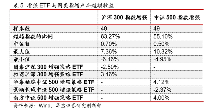 超额收益分化较大。从相对基准指数的超额收益上看,不同家的沪深300增强ETF、中证500增强ETF差异分化较大,招商沪深300指增超额收益位于同类型产品前20%分位数,而国泰沪深300指增超额收益位于后20%分位数;华泰柏瑞和南方中证500增强ETF超额收益位于前15%分位数,而景顺长城中证500指增ETF超额收益位于后20%分位数。这一类产品还是较依赖于管理人的管理能力。由于指增产品并不完全保持风格上的中性,因此Alpha来源可能一部分来源于风格的暴露。