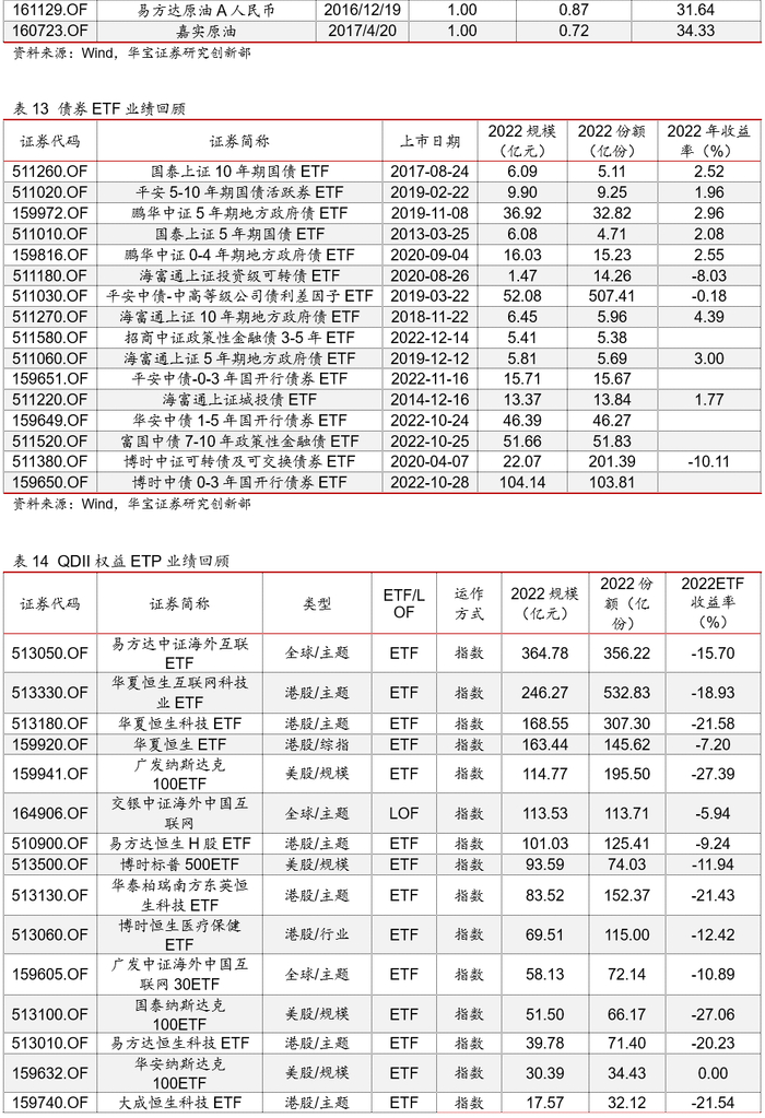 ETP回顾:存量ETF增长不俗,跨境和固收ETP乘势而上。(1)ETP规模变化:存量ETF现增长潜力,LOF规模遇大幅缩水,跨境和固收ETP成为规模新增长点。较于2021年底,ETP规模共减少10.73亿元。其中,新发基金贡献了1029.06亿元的规模增长,存量产品的规模受LOF基金的规模下降拖累减少了1039.79亿元。分产品形式看,仅ETF规模增加,LOF和封闭/定开基金规模均为减少。ETF中新发和存量产品规模增长相近。分资产类别看,跨境产品成为ETP产品增长主力,固收ETP取得较大突破。跨境ETP存量产品贡献85%以上增长,新发固收ETP规模增长较高。(2)基金公司ETP产品线:前十大集中度小幅提升,第九、十名洗牌重塑。截止2022年底,ETP规模前十大基金管理人占全市场的65.55%,相较于2021年底的63.08%有微幅提升。广发基金和博时基金新晋ETP管理规模第九、十名基金公司。(3)ETP产品创新:内地与境外互联互通加快,债券ETF投资品种丰富。跨境ETF产品扩容,低风险债券ETF增长亮眼,ESG指数产品丰富,第二批增强ETF上市。