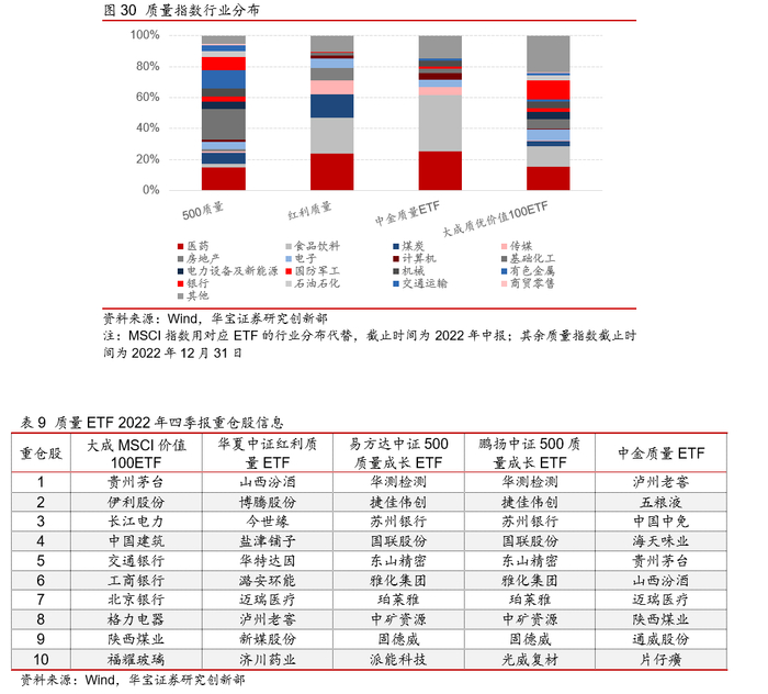 从指数的行业分布来看,500质量和大成质优价值100ETF的行业分布更均匀,红利质量和中金质量ETF的行业集中度更高,前十大行业集中度分别达到了90%和85%左右,持有较多的行业有食品饮料、医药等。此外,红利质量指数因还含有一定的红利因子,持有煤炭的比例相对较高。500质量指数因为样本空间为中证500指数,在基础化工、有色金属上相对其他质量指数持有较高的比例。500质量指数和大成质优价值100ETF还持有较高的银行行业股票。观察基金2022四季度的重仓股信息可以和行业信息相互印证。