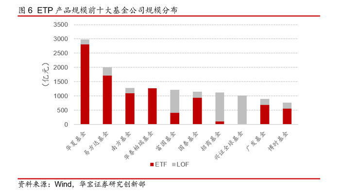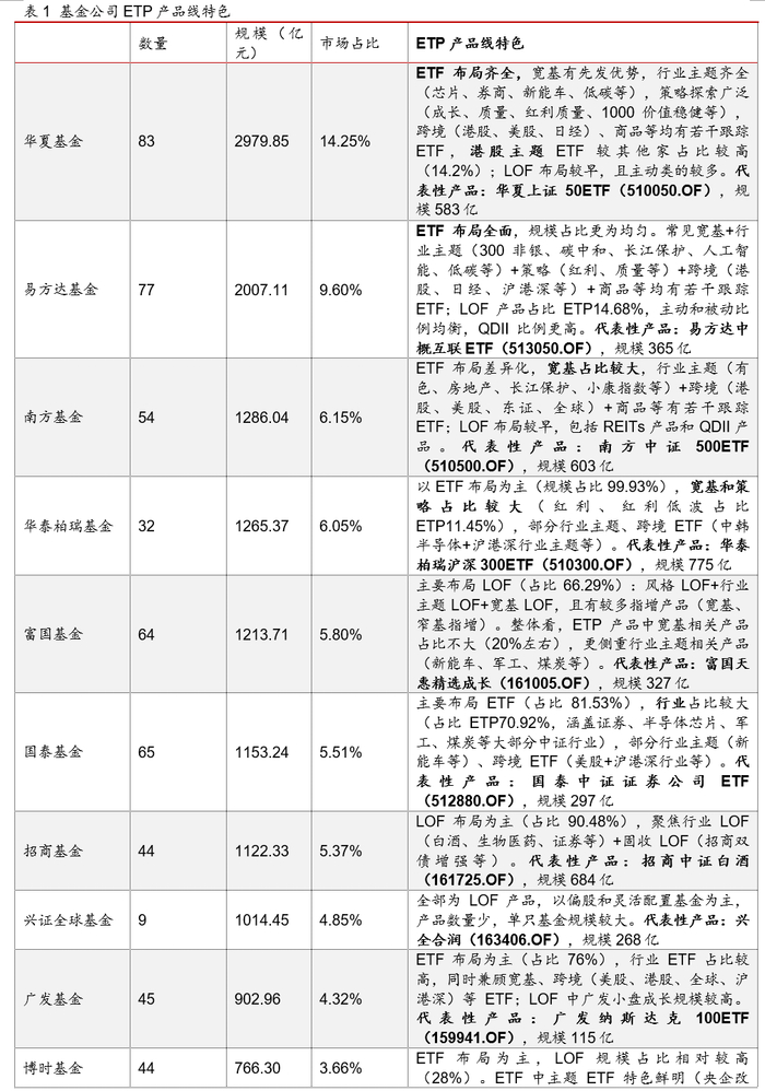 ETP规模前十大的基金公司在产品布局上各有特点,华夏、易方达、南方等基金公司ETP规模排在前列,以ETF为主,宽基产品有先发优势;华泰柏瑞的策略ETF规模较大;国泰和广发基金主要依靠行业主题ETF做差异化;招商、兴证全球、富国是LOF产品比较有特色的基金公司;跨境产品上,华夏、易方达的ETP规模较高。