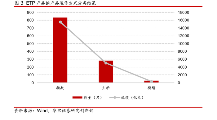 针对权益、固收及跨境ETP,根据产品运作方式,我们将其继续细分为主动、指数增强及指数三大类。截止2022年底,市场上共有:835只指数ETP,规模15567.76亿元;283只主动ETP,规模5035.75亿元;25只指数增强ETP,规模303.51亿元。