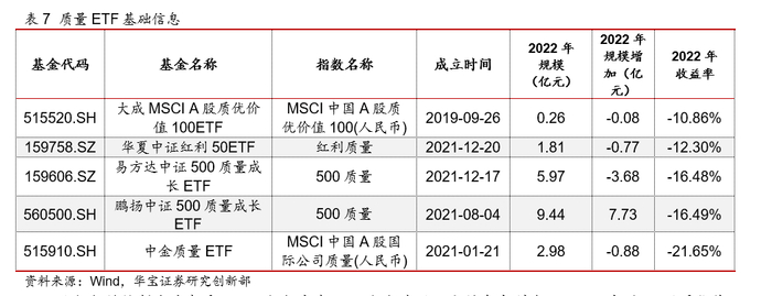 在目前的策略ETF中,除了红利、低波类策略,质量因子也是常用的一类策略因子。质量因子常用于判断上市公司的财务表现是否优秀,但不同机构对这个因子的构建也会用到不同的指标,常见的指标如衡量盈利能力(ROE/ROA)、盈利稳定性(EPS波动率等)、资本结构(负债率)、成长性(EPS增长率等)、会计质量(应计利润率)、派息(红利)、摊薄和投资能力(资产增长率)的等等。目前市场上有5只质量ETF。从2022年的收益率来看,2022年跟踪MSCI中国A股质优价值100(人民币)的ETF收益最佳,下跌幅度最小,其次是红利质量、500质量和MSCI中国A股国际公司质量(人民币)。2022年规模增加最多的是鹏扬中证500质量成长ETF。