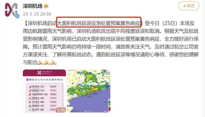 3月25日,深圳机场启动大面积航班延误应急处置预案黄色响应!