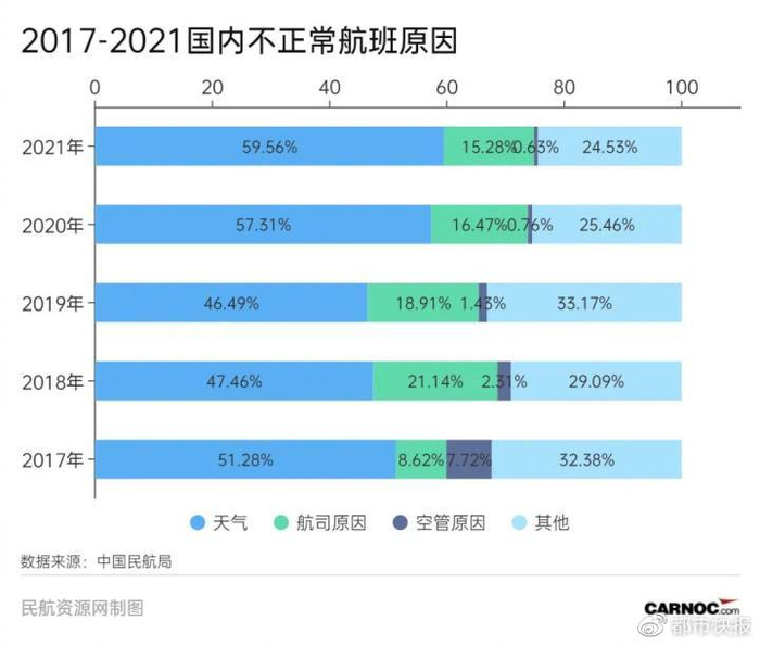极端的天气状况、流量管控、飞机调配困难、飞机故障等问题,都有可能造成航班延误。其中,糟糕的天气是不正常航班最主要的原因之一。数据显示,2021年,天气原因占不正常航班原因的比重达到59.56%。