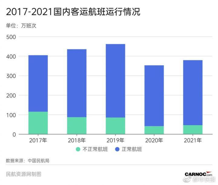 数据显示,从2017-2021年国内不正常航班相关数据来看,不正常航班占比已由2017年的28.32%降至2021年的12%。