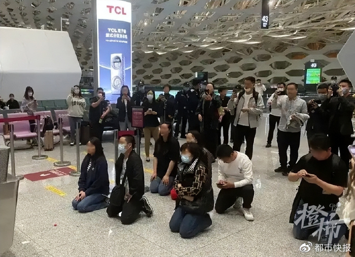 机场内,几名旅客在公众场合突然跪下。消息称,这些旅客希望航班能够起飞。