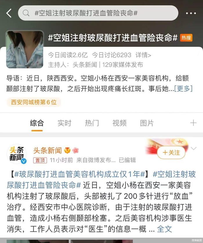 据报道,空姐小杨在西安一家成立仅一年的美容机构给额颞部注射玻尿酸后开始出现疼痛长红斑。事后,头部美容机构在小杨头部扎200多针进行“放血”治疗,对方称为其注射了溶解酶。经西安市中心医院诊断,由于注射的玻尿酸打进血管,造成小杨右侧颞部栓塞。之后美容机构涉事医生在小杨交了1万元的费用以后凭空消失,并且工作人员表示对“医生”的信息一概不知,只能代表机构谈和解条件。