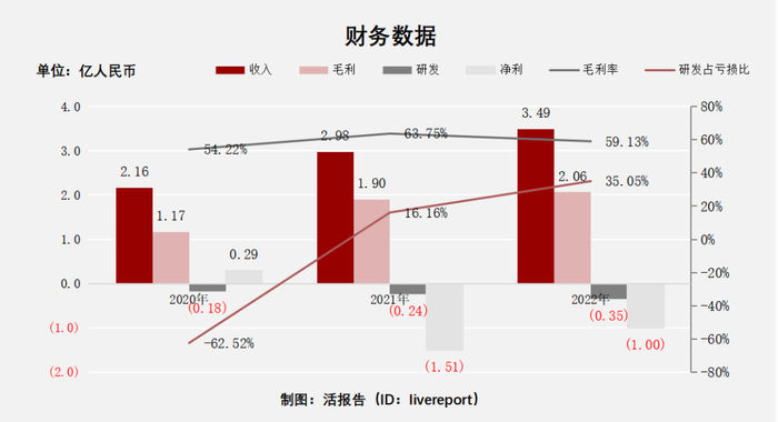 净利润21、22年是亏损状态,研发投资基本稳定在0.2亿左右,研发占亏损比例较高,毛利率基本稳定在5-60%左右;