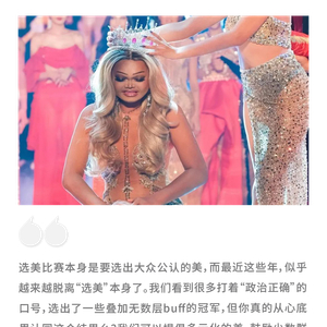 虽然现在评价美貌,也把个人的品行、性格、内心力量等纳入评判标准,但在纯粹的比美中,实在不该喧宾夺主。