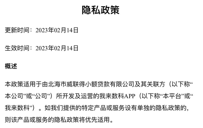 今年2月14日,我来数科APP更新了其用户注册及服务协议和隐私政策,政策适用于由北海市威联得小额贷款有限公司及其关联方所开发及运营的我来数科APP。金融虎网注意到,其隐私政策披露了我来数科收集、使用个人信息的目的及范围。粗略来看,用户在账号注册与登陆、助贷产品、贷款资格额度及偿付能力风控审核、借款推荐、还款协助服务、贷款管理服务、交易记录、第三方服务、下单及支付服务、支付功能、交易安全、个性化分析与推送、客服与投诉等方方面面需均被我来数科采集相关信息。