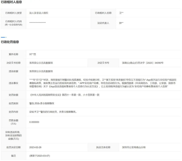 金融虎讯 3月27日消息,我来数科又因其APP违规遭到警告。据广东省行政执法信息公示平台行政处罚信息显示,深圳市公安局南山分局接省厅网警总队线索通报,经技术检测分析,卫盈联信息技术(深圳)有限公司旗下应用“我来数科”存在以下违规行为:App首次运行未经用户阅读同意隐私政策,就收集正在运行的应用列表信息;APP未经用户同意,存在自启动的行为,上述行为被认定为“未经用户同意收集使用个人信息”。深圳市公安局南山分局其给予警告,并责令其限期整改,处罚日期为今年2月28日。