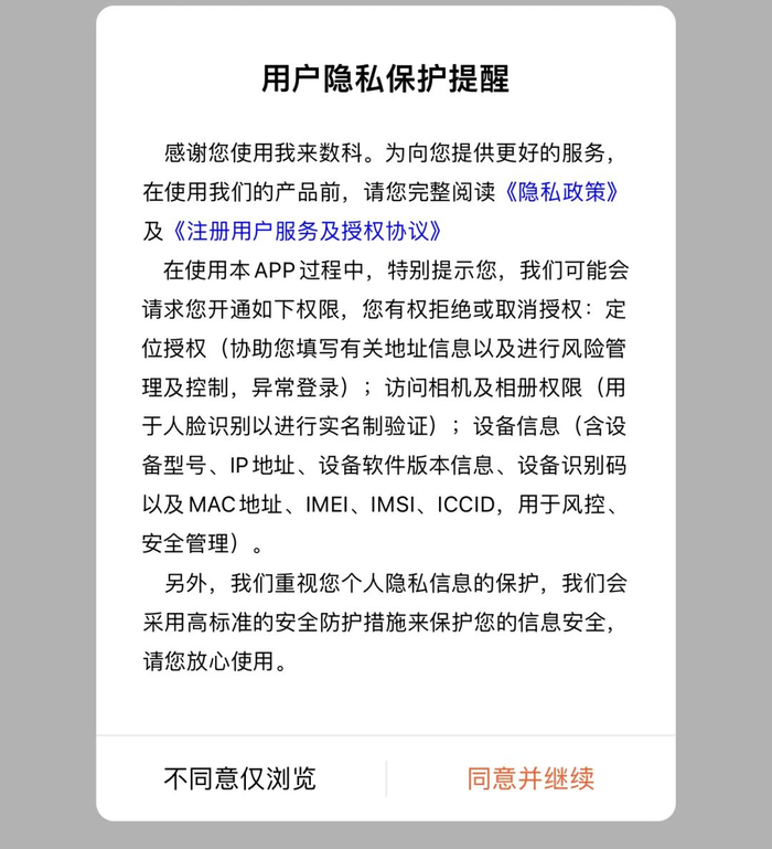 采集用户个人信息所为何用?金融虎网通过测试发现,目前,下载打开我来数科APP后会提示,在使用其APP过程中,可能会请求用户开通定位授权、访问相机及相册权限、设备等信息。我来数科声称,重视用户个人隐私信息的保护,会采用高标准的安全防护措施来保护信息安全。