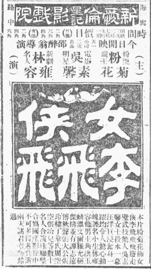 早在1925年,中国就上映了一部以女性为主角的功夫武侠片《女侠李飞飞》,自此“女侠片”成为一个功夫武侠片中的独特类型。
