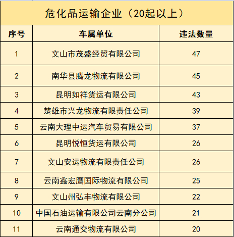 危化品运输交通违法数在20起以上的企业有11家,分别是: