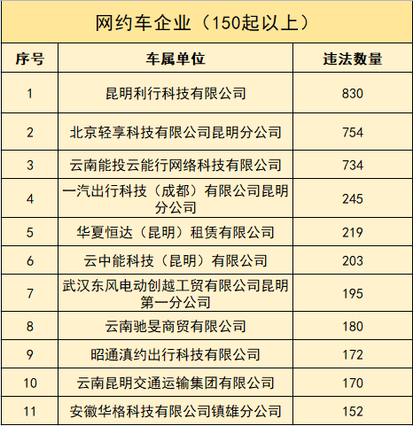 网约车企业交通违法数在150起以上的企业有11家,分别是: