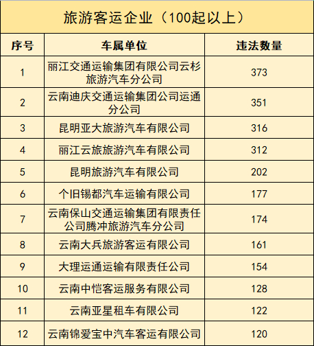 旅游客运交通违法数在100起以上的企业有12家,分别是: