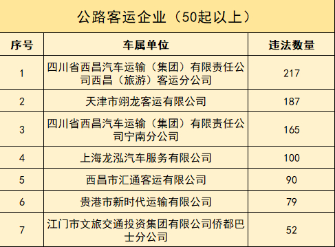 公路客运交通违法数在50起以上的企业有7家,分别是:
