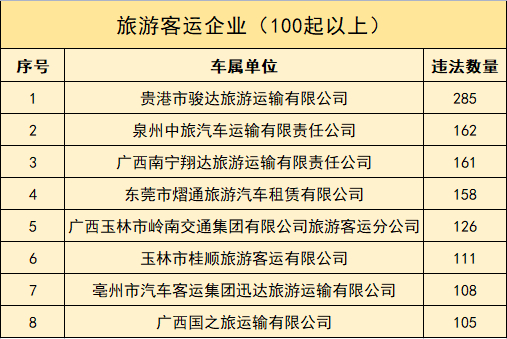 旅游客运交通违法数在100起以上的企业有8家,分别是: