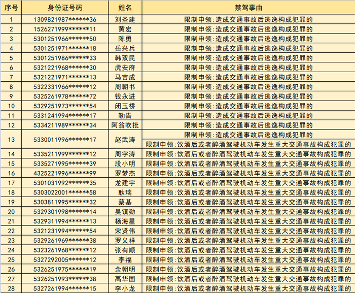 2023年2月21日—2023年3月20日,云南省共有28人受到终生禁驾的处罚。其中,因饮酒后或者醉酒驾驶机动车发生重大交通事故构成犯罪被终生禁驾的有16人。酒驾醉驾一直是公安机关严厉打击的严重交通违法行为,希望广大交通参与者把交通安全放在心上,珍爱生命,拒绝酒驾!