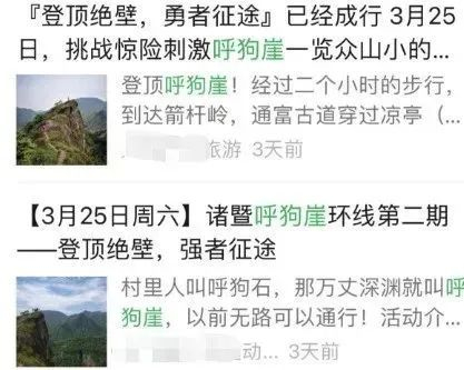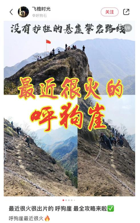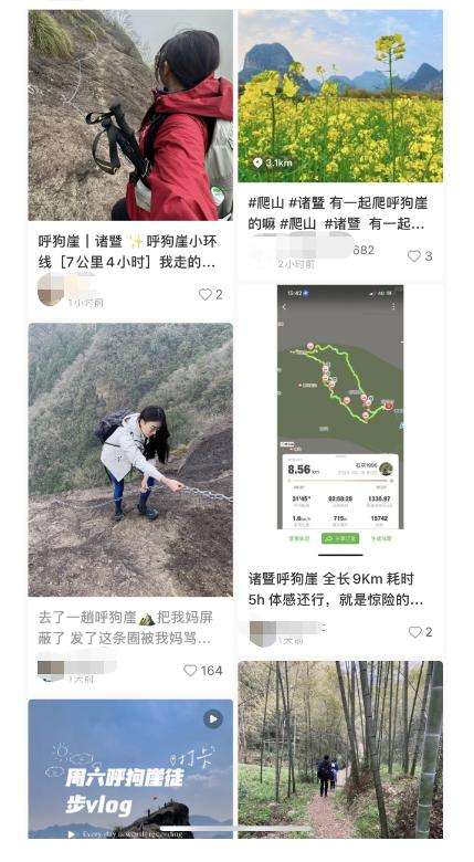 诸暨呼狗崖徒步爆火后,社交平台上每天都有人发呼狗崖的打卡笔记和徒步攻略。