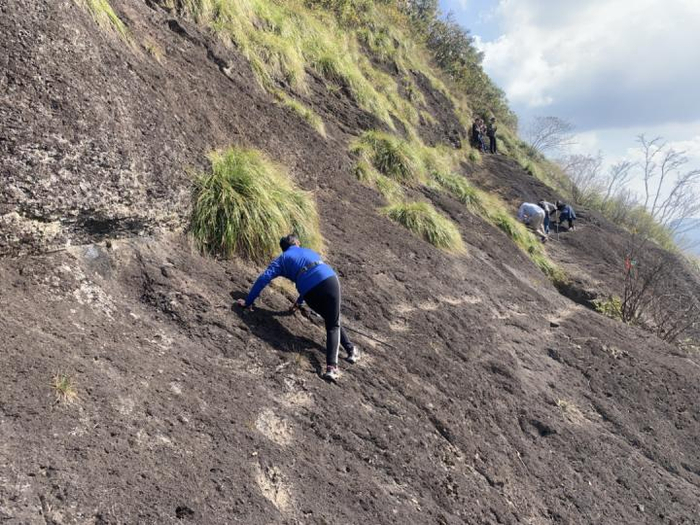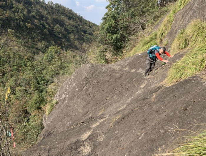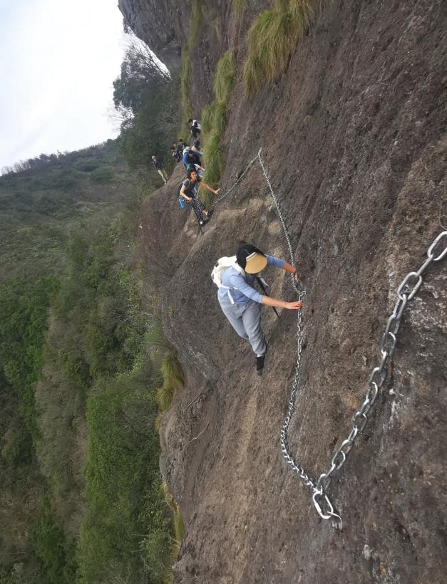 萍姐是一个经验丰富的登山爱好者,她是前年去爬呼狗崖的,当时还没有安装铁链。据萍姐说,即使在做好防护的情况下,这条线路依然走得战战兢兢,徒步到这一段,整个人都要贴在崖壁上,感觉一不小心就会掉下去,同行的一名友人下山后仍后怕不已。