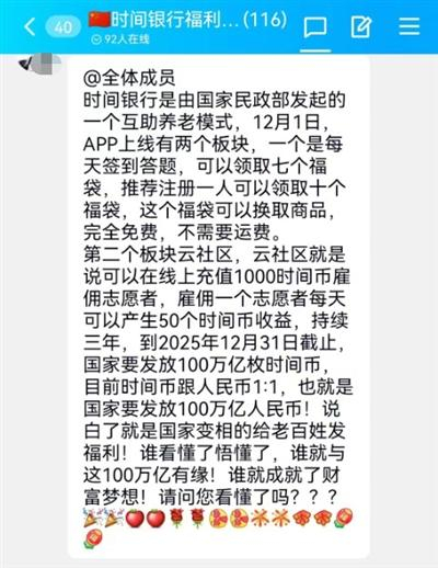 近期,一些社交平台流行起一种基于互助养老模式的新型投资方式“时间银行”App,主打“收益高,风险低,背靠国家新出台养老政策”,吸引了许多中老年人参与。
