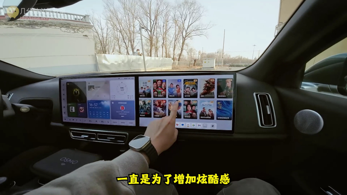 比如这个屏幕,我对这种屏幕的评价一直是为了增加炫酷感,直到于姐有一次用试驾车副驾驶屏幕看了两集甄嬛传。别问为什么不是管桐,管桐一般专业测躺椅舒适度,所以我在想,是不是我在评价一辆车的时候,这个屏幕对人的眼睛,尤其是儿童的眼睛是否有保护,软件内容的含金量和消费模式都应该计入到我评测的范围内。