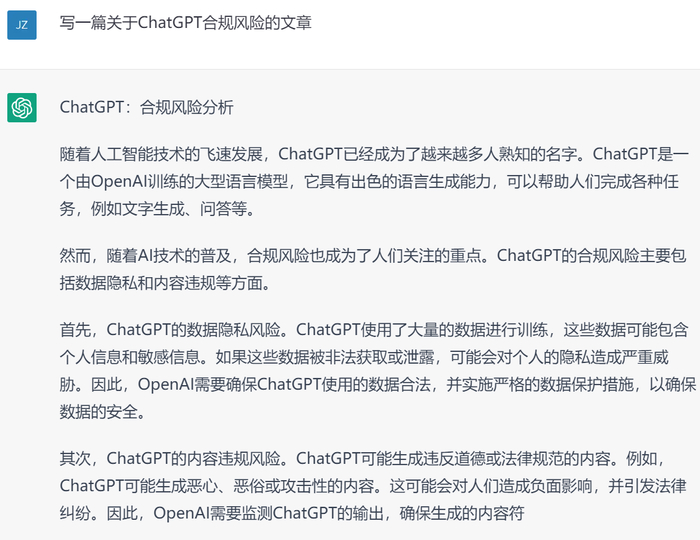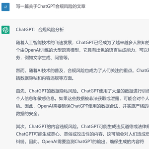 于是,我们尝试用ChatGPT写一篇关于其自身法律合规风险的文章。我们将人机合作写作本文的过程和结果尽量真实完整呈现出来,以此展示:ChatGPT是如何发挥作用的;ChatGPT本身存在哪些法律合规风险。