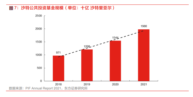 沙特公共投资基金(PIF)成立于1971年,是全球最大的主权财富基金之一,截至2021年共管理19800亿沙特里亚尔资产,实现 25%的年化回报。