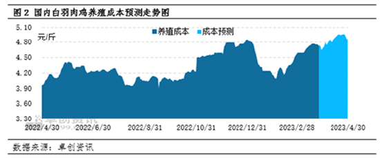 综合饲料和鸡苗成本来看,饲料跌幅空间较小,受鸡苗价格涨幅较大拉动,4月肉鸡养殖成本呈高位上涨趋势,卓创资讯预计4月肉鸡养殖成本为4.87元/斤,环比涨幅4.06%。