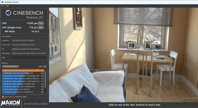 Cinebench R20实测多核成绩为11285pts、单核成绩为776pts,属于目前移动平台的旗舰级水平,与桌面平台的i7-13700K比较接近,这个表现非常强悍。