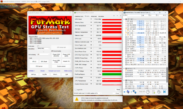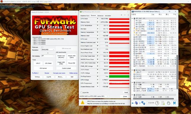 10分钟压力测试显示,RTX 4080 Laptop的功耗稳定在175W左右,此时核心频率1740MHz,显存频率2375MHz,核心温度83℃左右。175W的性能释放不存在短板,非常给力。